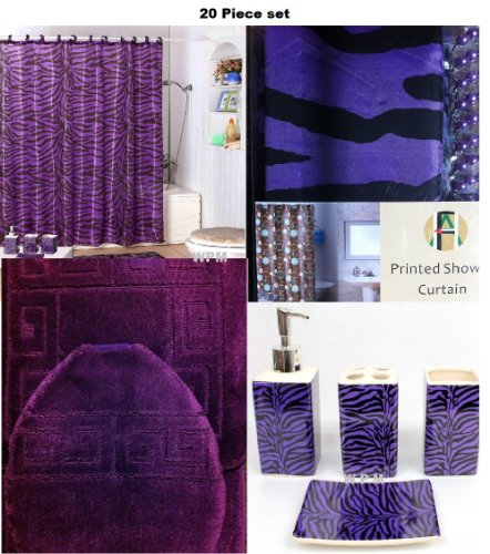 20 Piece Bath Accessory Set Purple Bath Rug Set + Purple Zebra Shower Curtain & Accessories